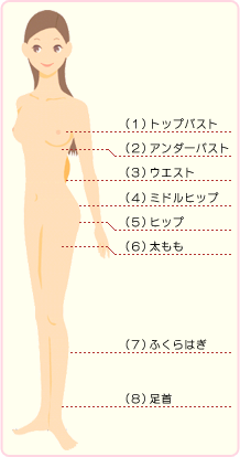 あなたはご自分の正確なボディーサイズを知っていますか? ずいぶん以前に測ったボディサイズを信じ込んでいませんか? 女性の身体は時とともに変化します。 正しい下着選びは正確なボディサイズを測り、 自分のからだをよく知ることから始まります。 |